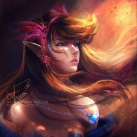 sort of adornment on her head, possibly part of her magical or ceremonial attire. Her expression and the way she's gazing off into the distance suggest