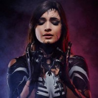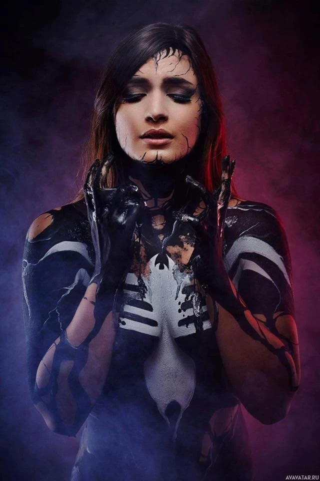 The image shows a woman dressed in a black and white bodysuit with detailed designs that resemble the appearance of the character Venom from