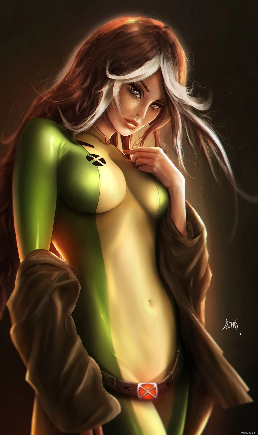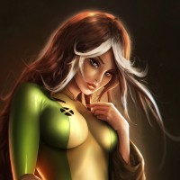 На картинке изображена женщина-персонаж, одетая в зеленый и желтый костюм, напоминающий костюм, который носил Роуг из серии комиксов «Люди Икс». У нее волосы распущены, и она смотрит в сторону от зрителя с вдумчивым выражением на лице. Художественный стиль предполагает, что это может быть иллюстрация фаната или произведение концепт-арта для персонажа.