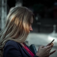 The image shows a young woman with blonde hair looking down at her cell phone. She is seated and appears to be focused on the device in her hands. The setting suggests an urban environment, possibly during the evening as there is a warm glow around her, which might be coming from street lights or other ambient lighting.