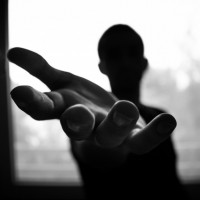 The image shows a silhouette of a person with their hand outstretched towards the camera. The background is blurred but appears to be an indoor setting, possibly a room with windows or doorways that are not visible in detail due to the focus on the silhouette.