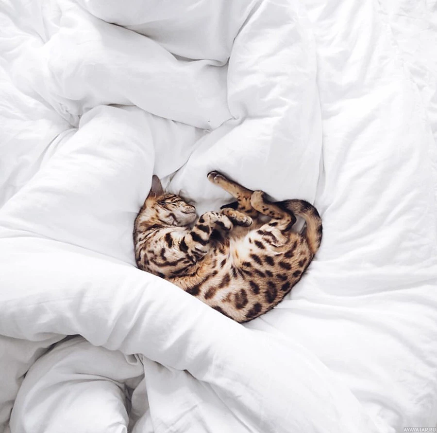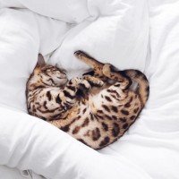 wild feline, curled up and sleeping on top of white bedding. The cat appears to be in