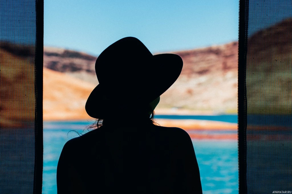 outside scene. She appears to be wearing a hat. The setting looks like a cozy interior space with warm lighting, contrasted by the cooler blue tones outside where there's water visible, suggesting this could be a lake view or a riverside location during either dawn or dusk due to