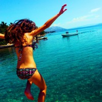 floral patterns and appears to be in mid-air, suggesting an energetic and joyful moment as she jumps into the water. There are no other