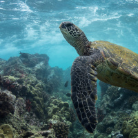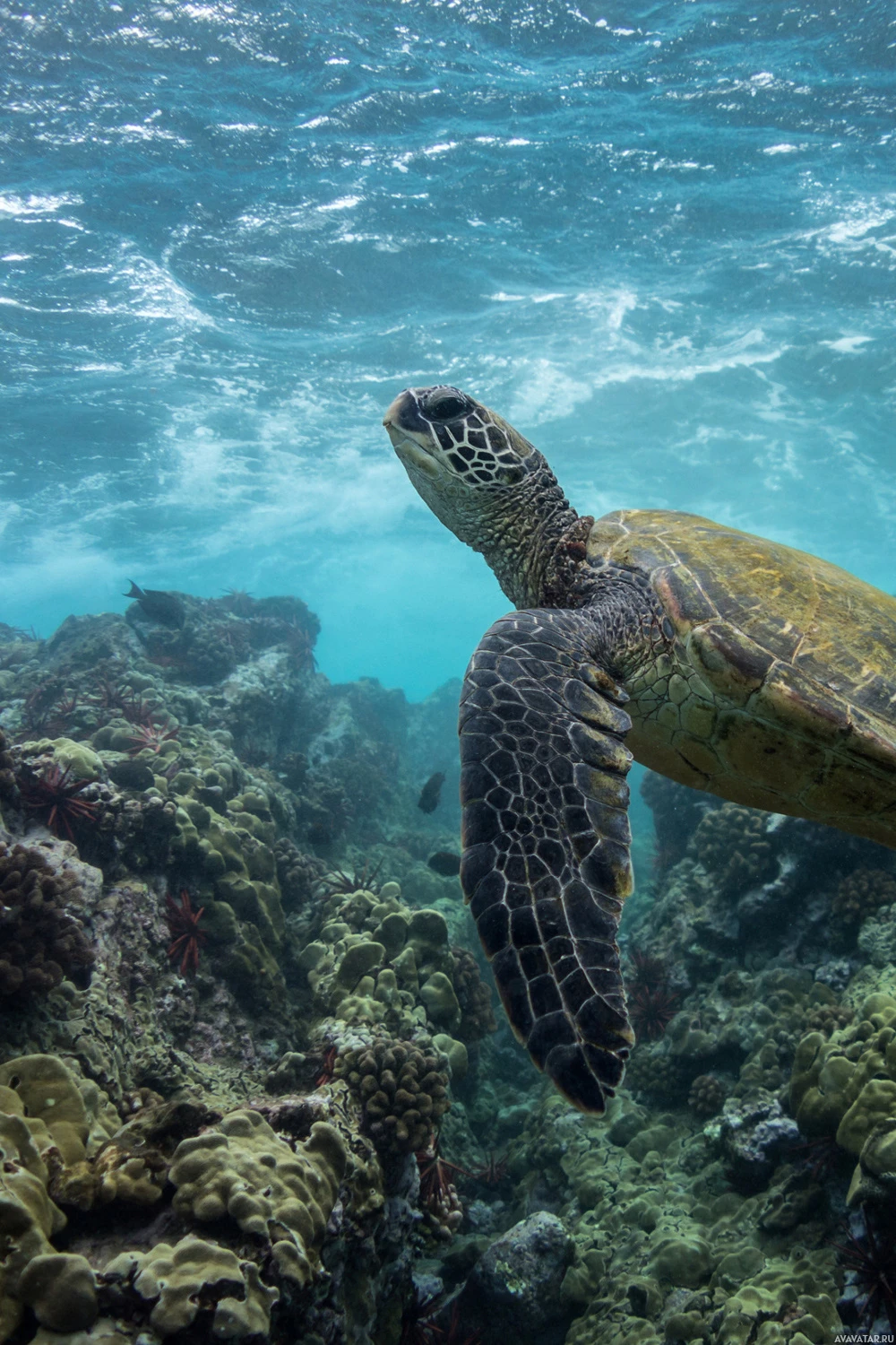 a sea turtle, which is known for its distinctive pattern of scales and flippers. The turtle is surrounded by coral reefs or a similar