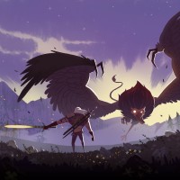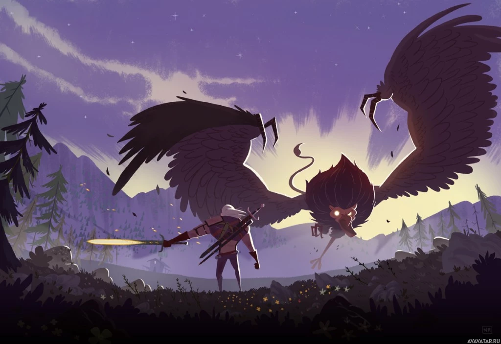 Geralt of Rivia in an animated style. He is standing on a hill with his sword drawn, facing down towards what appears to be a griffon, which is