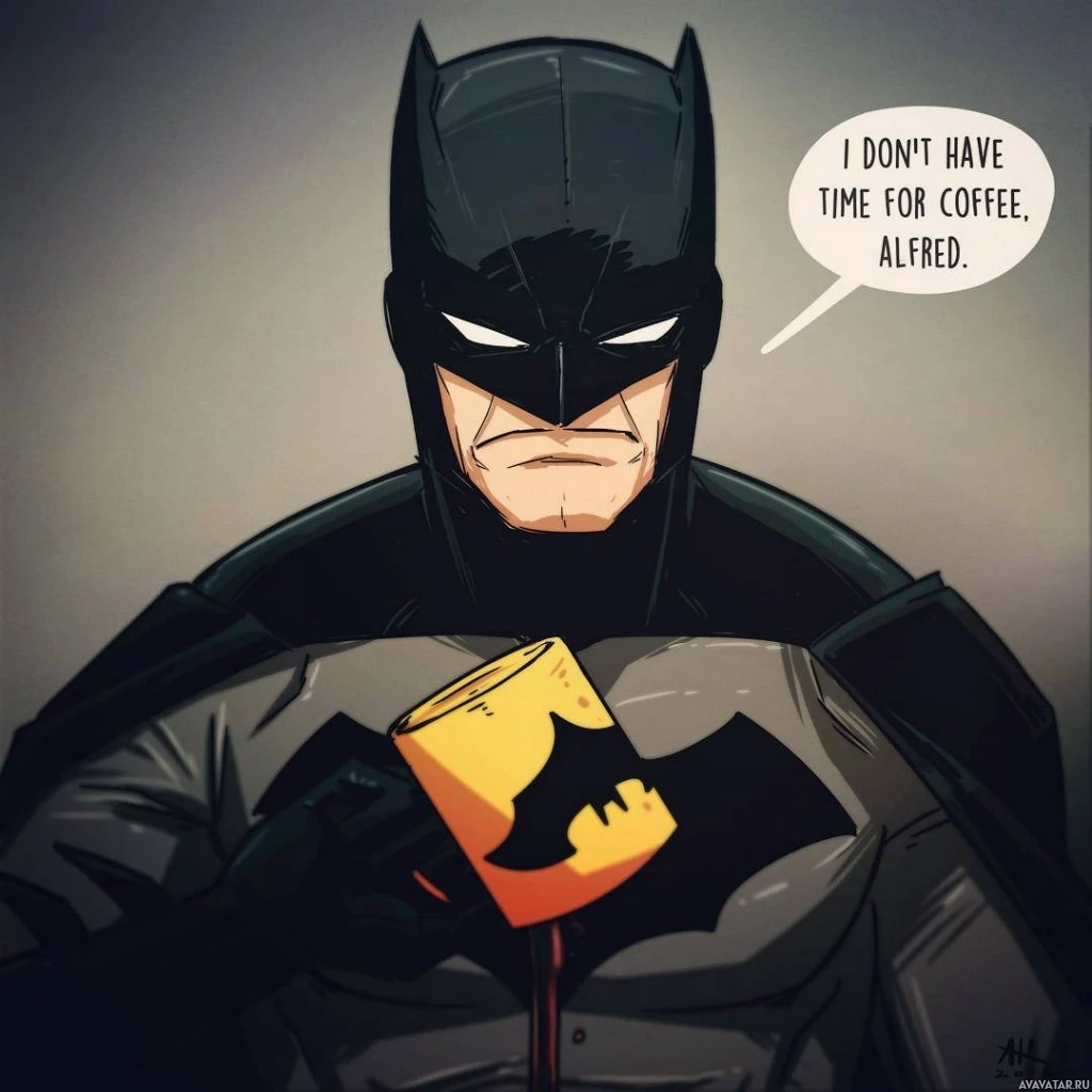 iconic costume and appears to be speaking or saying something, as indicated by the text bubble with the phrase "I don't have time for coffee, Alfred." This suggests that Batman might be busy or prioritizing tasks over enjoying