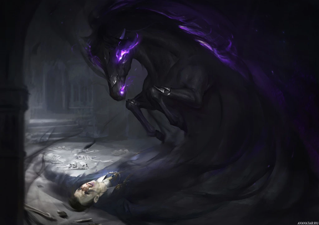 This is a digital artwork of a fantasy scene featuring a dark horse, likely representing the character Nightmare from "The Legend of Zelda: Breath of the Wild"