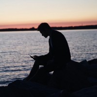 The image shows a silhouette of a person sitting by the water at sunset. The individual is looking towards the horizon, with a cell phone held in their hands, possibly reading or using an application on it. There is no contact information or explicit text within this picture.