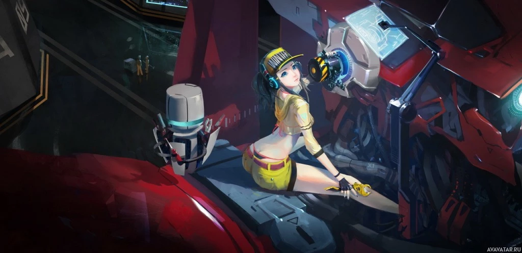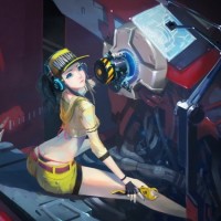 a yellow outfit with some black accents and has a blue headset on her head. There are various pieces of technology around her, including what looks like