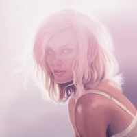 На картинке изображена женщина, сидящая на полу, смотрящая вверх спокойным и расслабленным выражением лица. У нее короткие светлые волосы и она носит безрукавный верх. Фон мягко освещен, создавая безмятежную атмосферу.