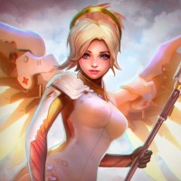 На картинке изображен персонаж из видеоигры «Overwatch». Персонаж — Мерси, которая известна своими целебными способностями. Она изображена в динамичной позе с широко расставленными крыльями и посохом в руке, которые являются знаковыми элементами ее дизайна в игре.