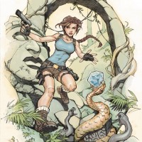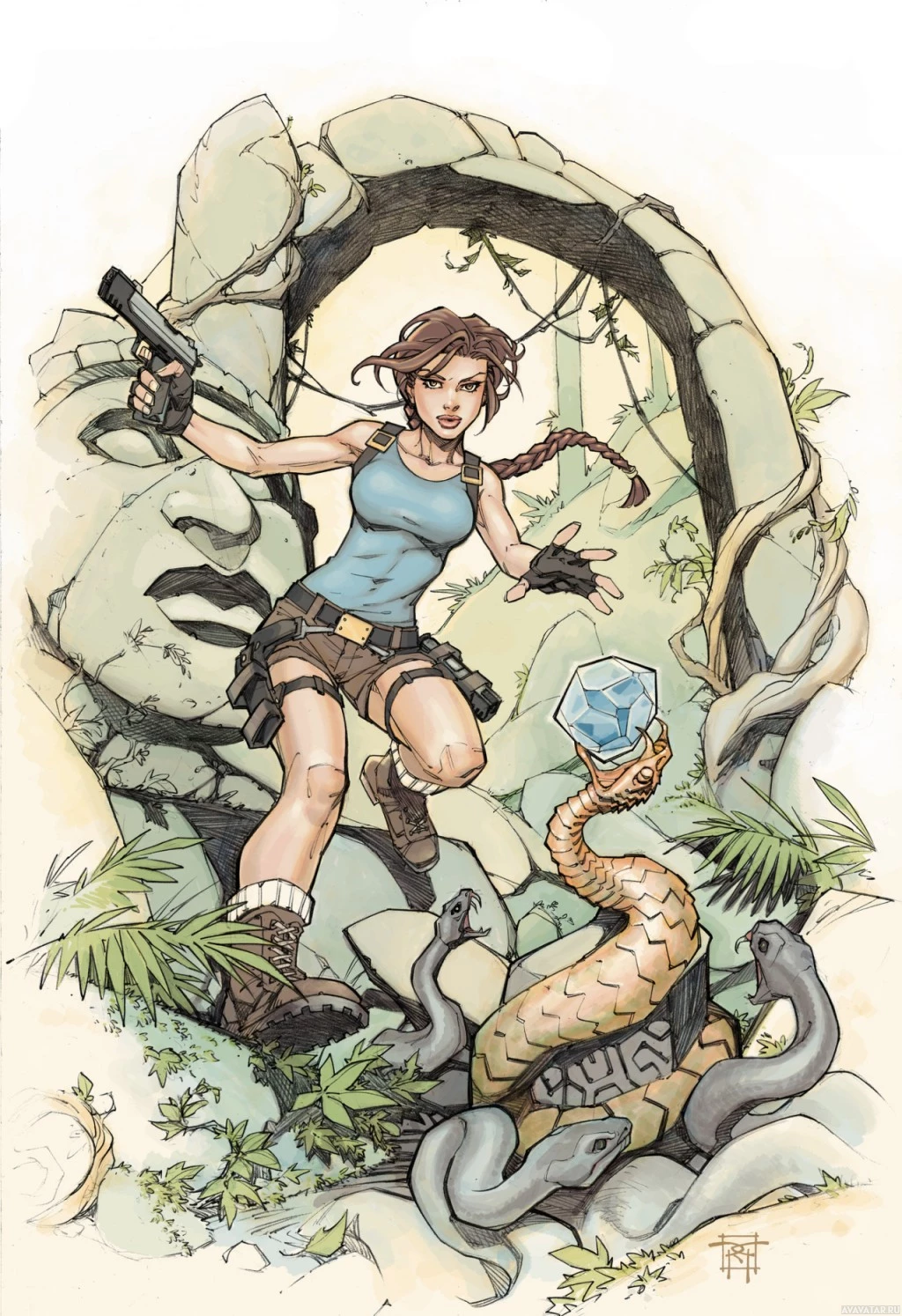 a female character, Lara Croft from the Tomb Raider game series, depicted in an action pose. She is holding a pistol and appears to be fighting against or standing over two snakes on the ground. The setting suggests she might be exploring an ancient or jungle-like environment, which aligns with the adventurous themes of her games. The artwork captures a dynamic moment, highlighting Lara's strength and preparedness in facing