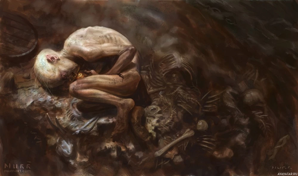 The image depicts a creature that appears to be Gollum from J.R.R. Tolkien's Middle-earth. It is shown in a crouched or hunched position, with its head bowed as if it is weeping or speaking in a low, sorrowful tone. The setting seems to be an underground or cave-like environment, which matches the description of Gollum's hiding spots in the books "The Hobbit" and "The