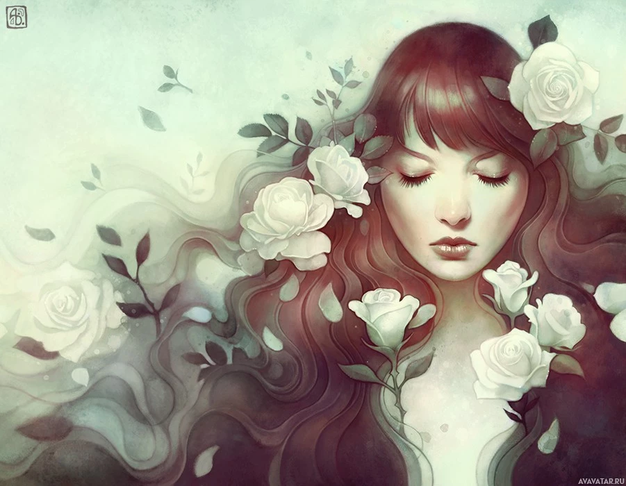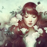 long hair and is surrounded by what appears to be a flurry of flower petals, suggesting a gentle breeze or a whimsical, dreamlike atmosphere. The overall mood conveyed by the image is serene and introspective.