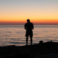На картинке изображен силуэт человека, стоящего на скалах у океана на закате или восходе солнца. Человек, по-видимому, занимается рыболовством, о чем свидетельствует наличие рядом с ним рыболовных снастей. Фон окрашен теплыми оттенками заходящего над водой солнца, создавая спокойную и безмятежную атмосферу.