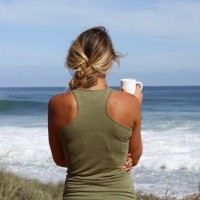 the seaside scenery. In front of her on a ledge or similar surface, there's a cup that appears to contain a beverage, possibly coffee or tea given its color and position. The surroundings suggest it is