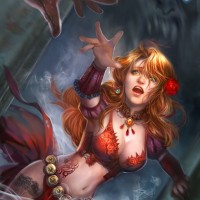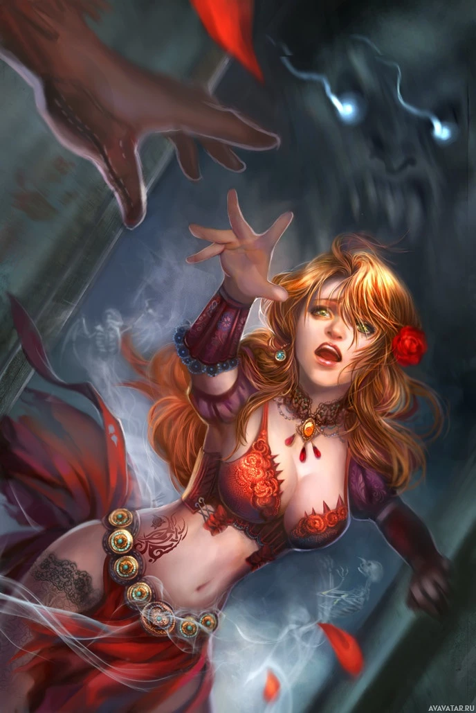yellow eyes. She has a hand reaching towards her as if in surprise or distress. The girl appears to be falling from