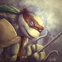 a serious expression, holding what appears to be sai knives in his hands, and wearing a signature bandana wrapped around his head. The art style suggests a stylized or comic-like interpretation of the character rather than