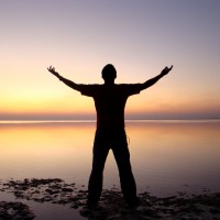 a silhouette of a person standing on the shore during what appears to be either sunrise or sunset, given the soft warm light. The individual is raising their arms in a gesture that could suggest excitement, joy, or triumph. The background features