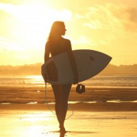 На картинке изображена женщина на пляже на закате. Она, кажется, силуэтом против заходящего солнца, придавая ей форму потемневшего контура, который контрастирует с теплым светом на заднем плане. Она держит под мышкой доску для серфинга и смотрит в сторону горизонта или океана. Пейзаж предполагает, что она может готовиться или возвращаться с сеанса серфинга.