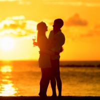 The picture depicts a silhouette of two people, likely engaged in an embrace. They appear to be at sunset on the beach, with the warm hues from