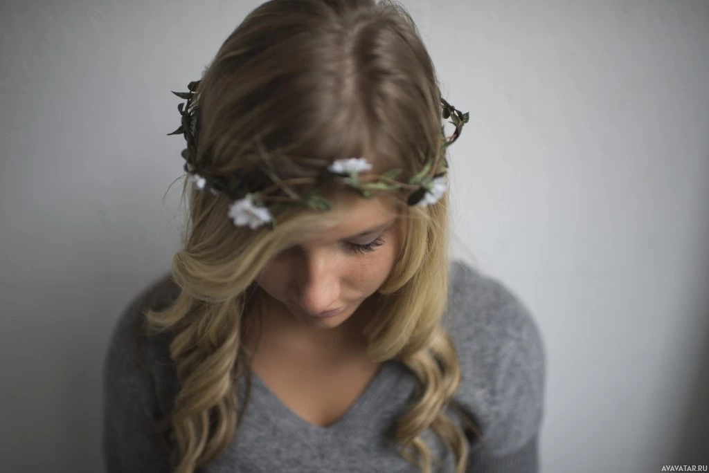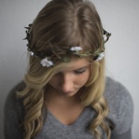 closed eyes, wearing what appears to be a wreath or headband adorned with flowers. They have long