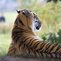 a large tiger lying down on the grass. The tiger is looking to its left and appears relaxed, with one paw resting behind it in