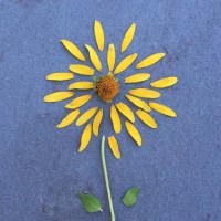 The image shows a single yellow daisy with a green stem and two leaves to the left of the flower. It appears to be placed on a grey surface, possibly concrete or stone, as there is no visible soil around it. The overall impression is one of simplicity and natural beauty.