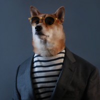 The image features a dog wearing human-like clothing and accessories. The dog is dressed in a gray suit with