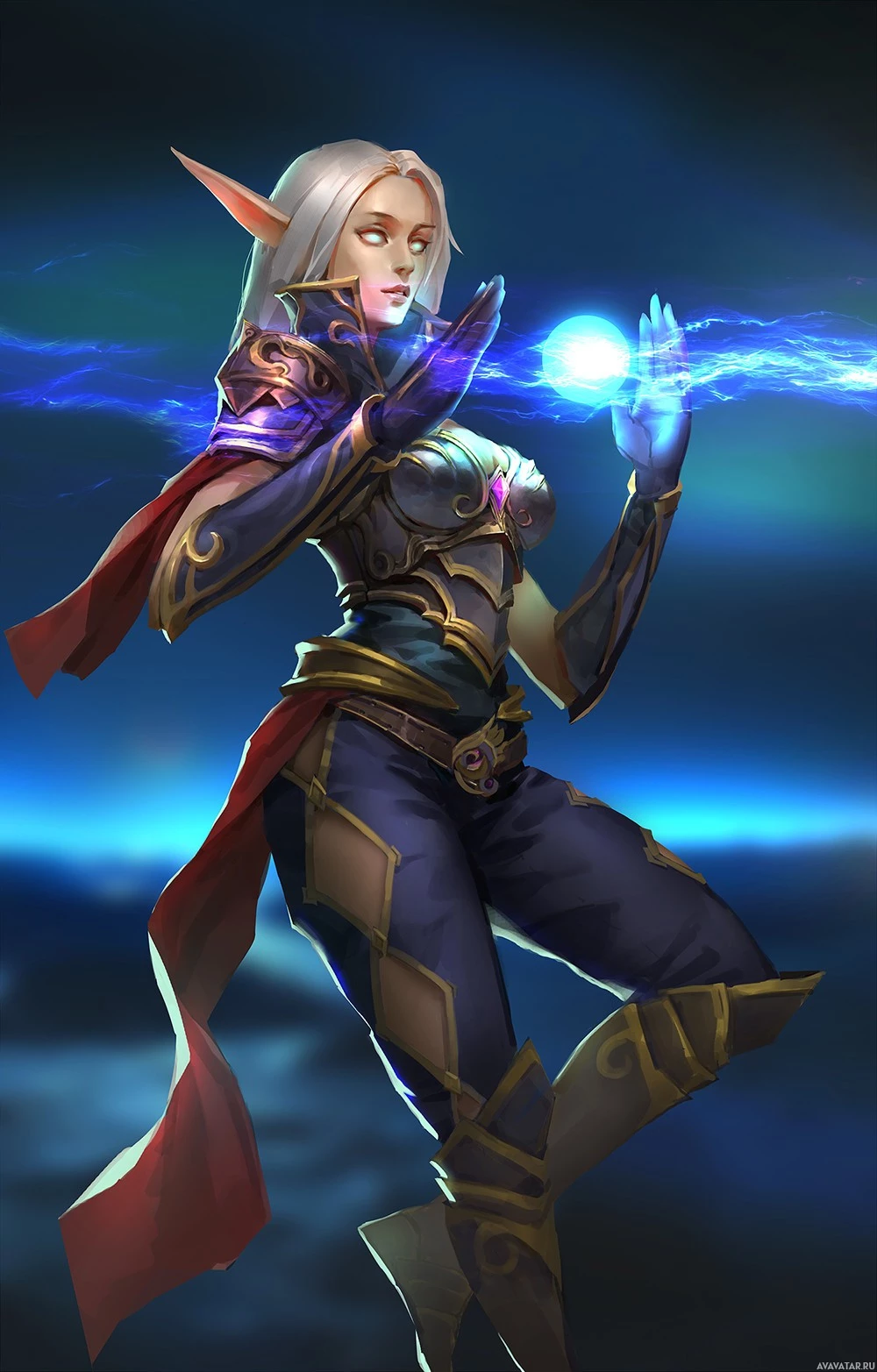 white hair. She has a fantasy-style appearance, wearing armor and holding what looks like magical elements or energy in her hand. The background is dark blue with