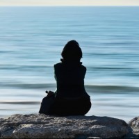 In the image, there is a person sitting on what appears to be a rock or jetty that extends out over the ocean. The individual is silhouetted against the sky and seems to be contemplating something. There is also