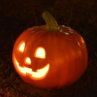In the picture, there is a carved pumpkin with a scary face, often associated with Halloween celebrations. It appears to be set against a dark background, possibly outside at night. The illuminated jack-o'-lantern is the central focus of the image and evokes the classic symbolism of Halloween festivities.