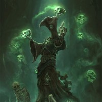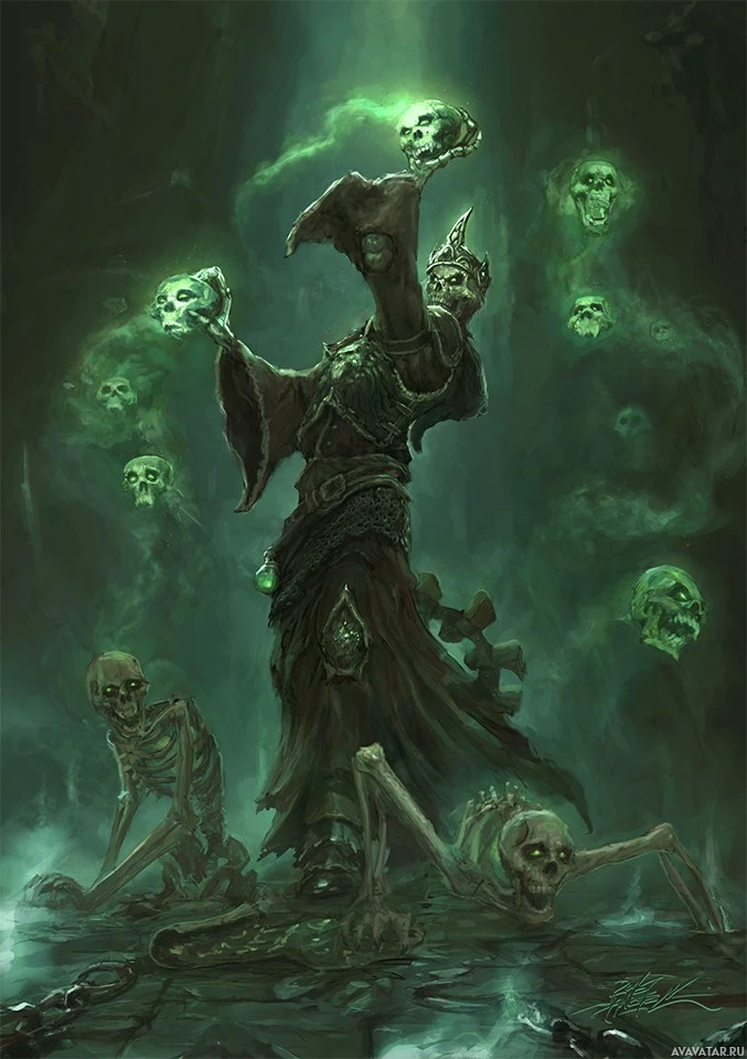 a fantasy scene with an undead character standing amidst floating skulls. The figure is dressed in tattered robes and holding a staff, casting a green