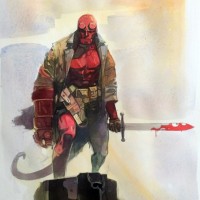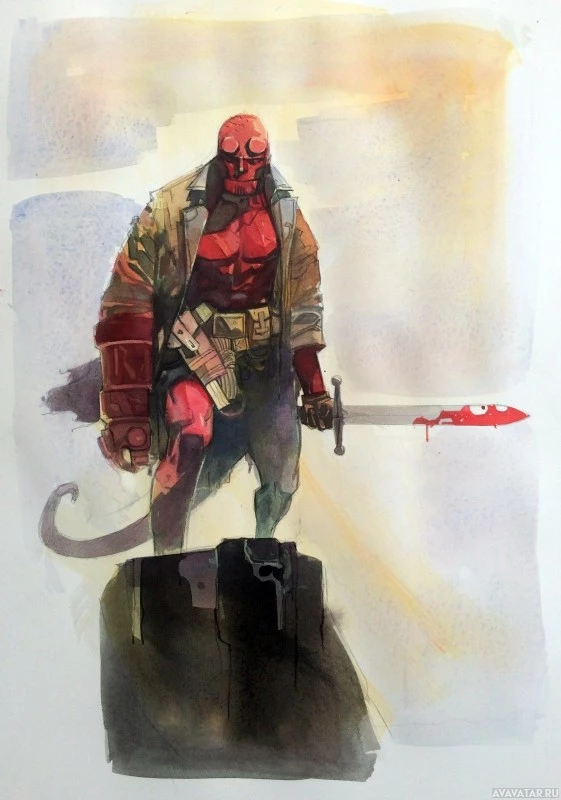 a large sword with a serpentine blade, which is characteristic of the Hellboy comics and films. The style of the artwork has an impressionistic quality, with visible