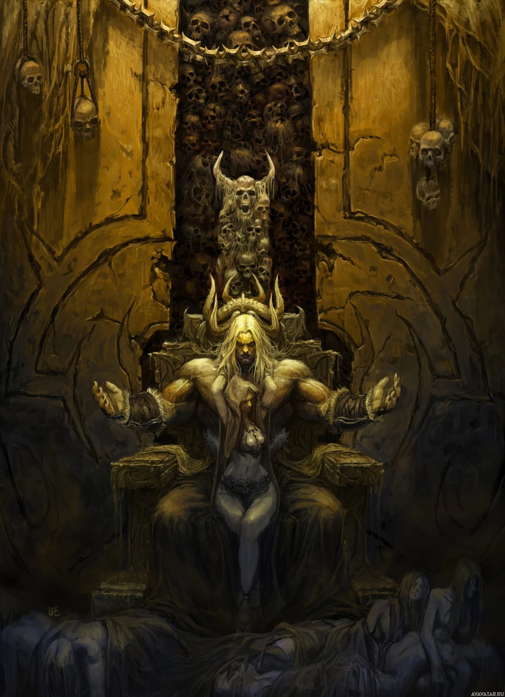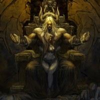 a fantasy scene featuring an individual seated on a throne, which is associated with a sense of power or royalty. There are various elements that suggest a dark or