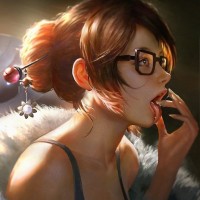 own hand, seemingly surprised or intrigued by something she's holding or examining. Behind her stands a robotic figure with a glowing eye, which could suggest a setting related to technology,