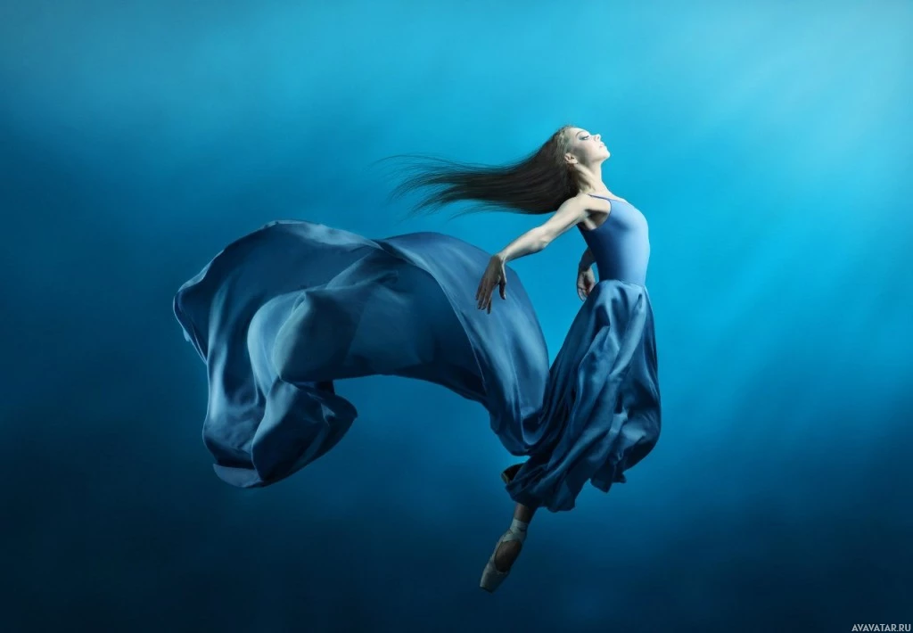 blue dress that billows out around her, creating a sense of motion and grace. Her arms are stretched upwards, possibly reaching for something above or simply embodying