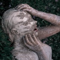 intense emotion on their face, and they have their hands up to their forehead as if trying to express frustration or distress. The overall scene has a dramatic and surreal quality, evoking a sense of