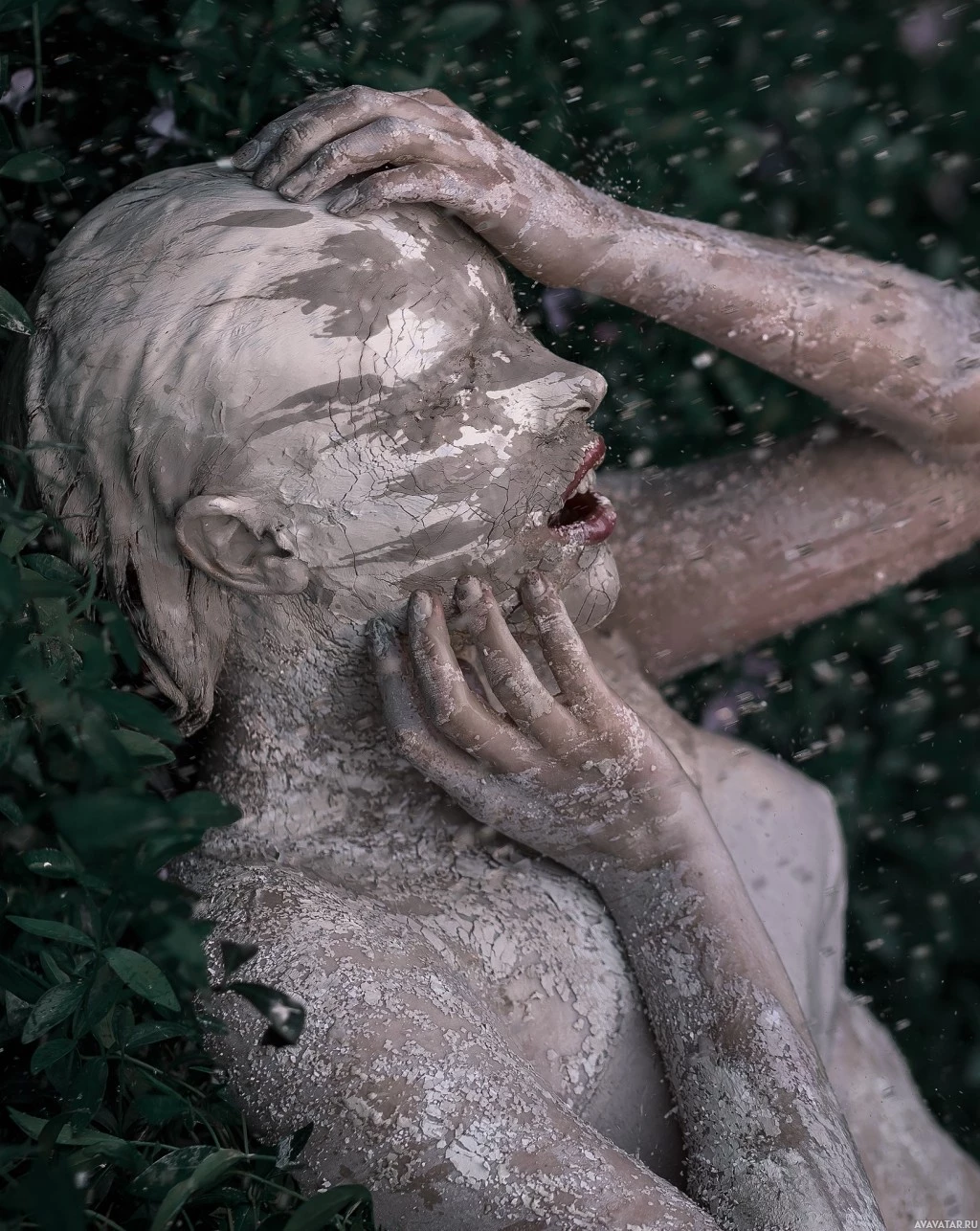 white substance, possibly paint or clay, sitting amidst greenery. The individual is looking away from the camera with an expression of