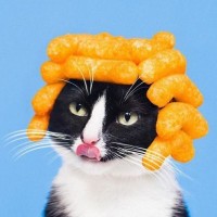 snack food. The cat seems to have its mouth open and tongue sticking out as if it's licking its paw, with the snacks arranged on its head giving an impression of horns or antlers. This playful arrangement of Cheetos is likely for a humorous or artistic purpose, such as creating an amusing