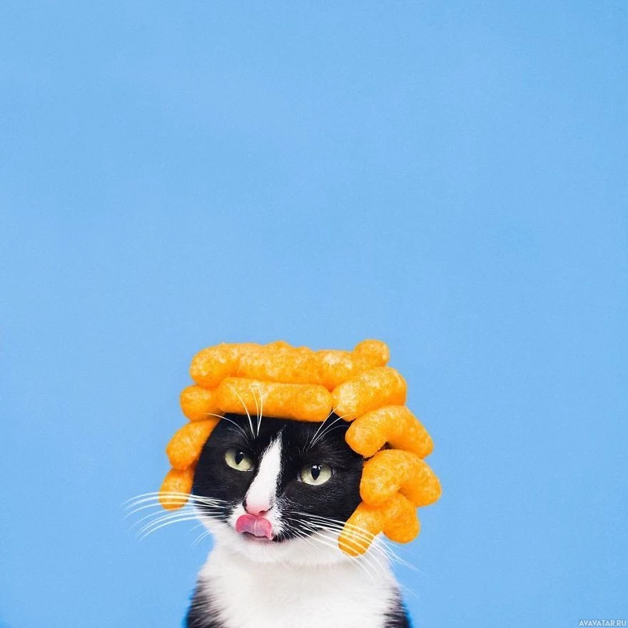 The image shows a cat wearing what appears to be a cone or wig made out of Cheetos, which is a type of cheese-flavored