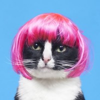 The image features a cat wearing a pink wig, resembling a human-style hairpiece. The background is solid blue, which contrasts with the subject to make it stand out.