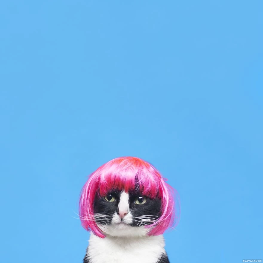 На картинке изображена кошка в розовом парике, напоминающая прическу в человеческом стиле. Фон сплошной синий, что контрастирует с предметом, чтобы выделить его.