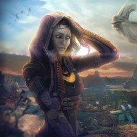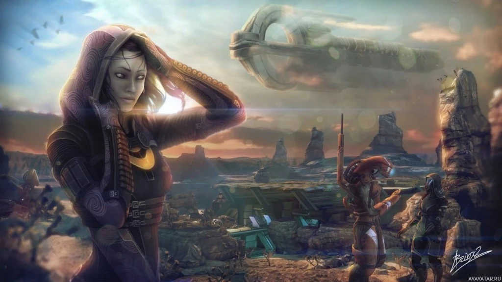 ruins in the background, suggesting that this could be a scene from one of the game's storylines where Tali is involved. The style of the artwork is detailed and suggests a narrative context within the Mass