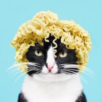 The image shows a cat wearing what appears to be noodles or ramen on its head, creating the illusion that it has a wig. The background is solid blue, which contrasts with the white and black