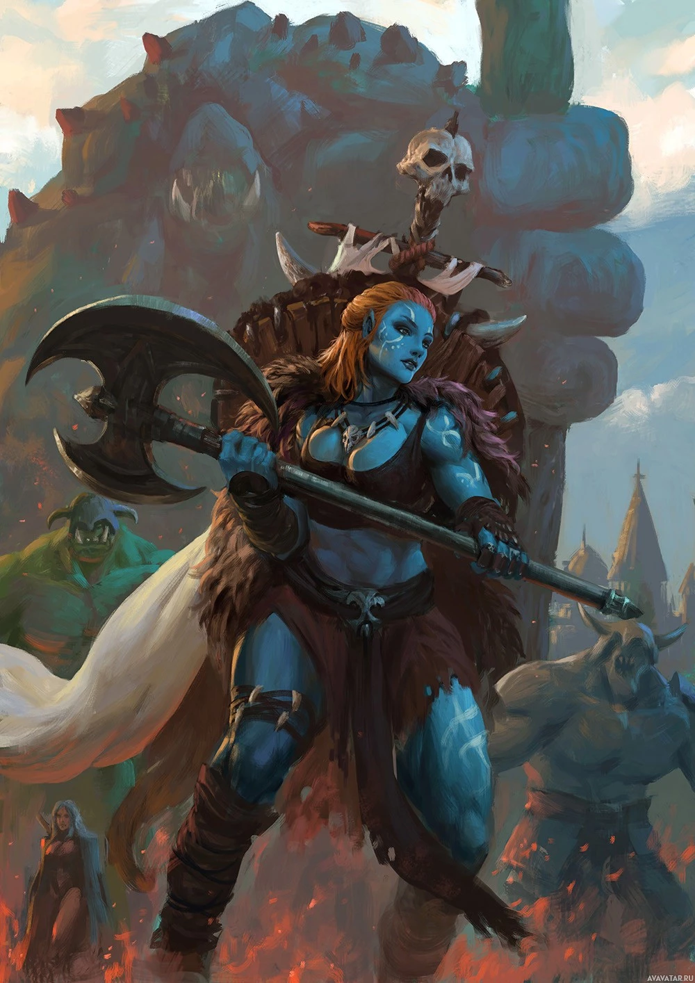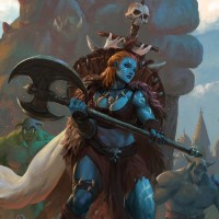 various characters. In the foreground, there is a character holding an axe and wearing armor that gives them a menacing appearance. Behind this central figure are two smaller figures: one appears to be a creature resembling a goblin or a similar