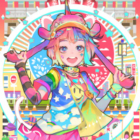 colorful clothing with vibrant patterns that contribute to the whimsical and cheerful atmosphere of the artwork. Surrounding the character are various colorful elements that resemble confetti, adding to