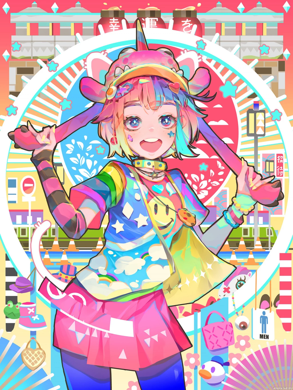 splashes of color, enhancing the overall playful and joyful theme. This type of image is commonly associated with anime or manga culture, where characters often display exaggerated