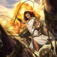 ancient times or part of a mythical narrative. The background has an explosion, which adds a dramatic element to the scene. The character is portrayed with confidence and determination as she rides into battle.